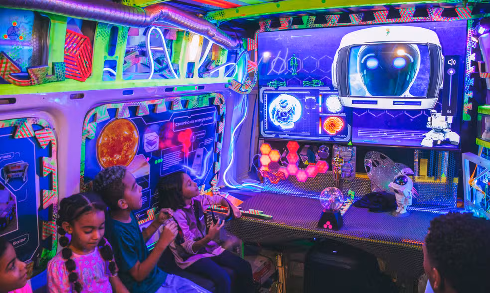Veículo transporta uma decoração de material reciclado e os objetos com princípios de magnetismo e eletricidade — Foto: Divulgação/CineSolar